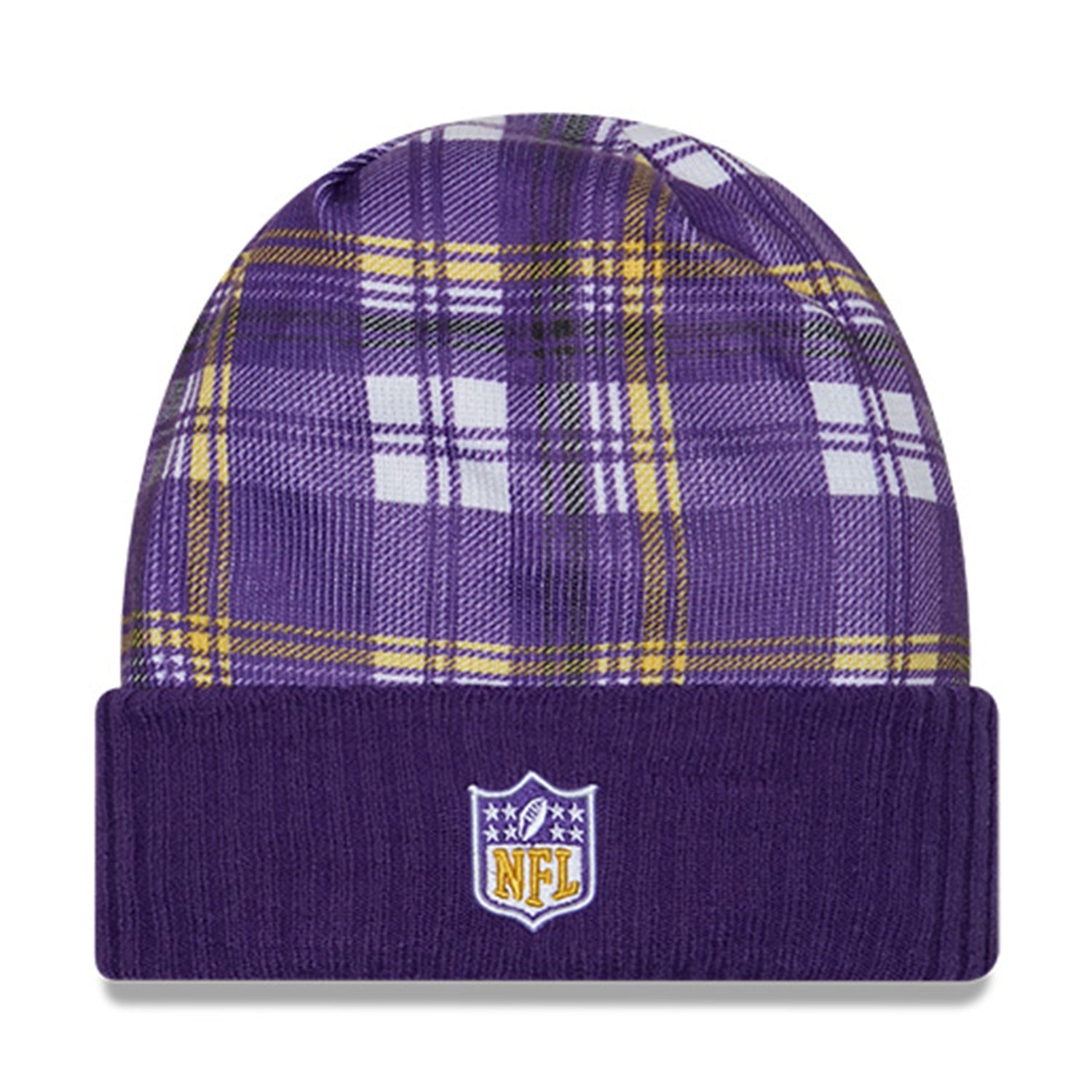 Make a bold cold-weather statement with this Minnesota Vikings 2024 Sideline Statement Knit Beanie from New Era. Featuring a standout purple plaid crown with gold and white accents, this knit cap brings serious Minnesota swagger to your winter game-day look. The embroidered Vikings logo on the cuff delivers unmistakable team pride, while the official NFL shield on the rear adds authentic on-field energy.