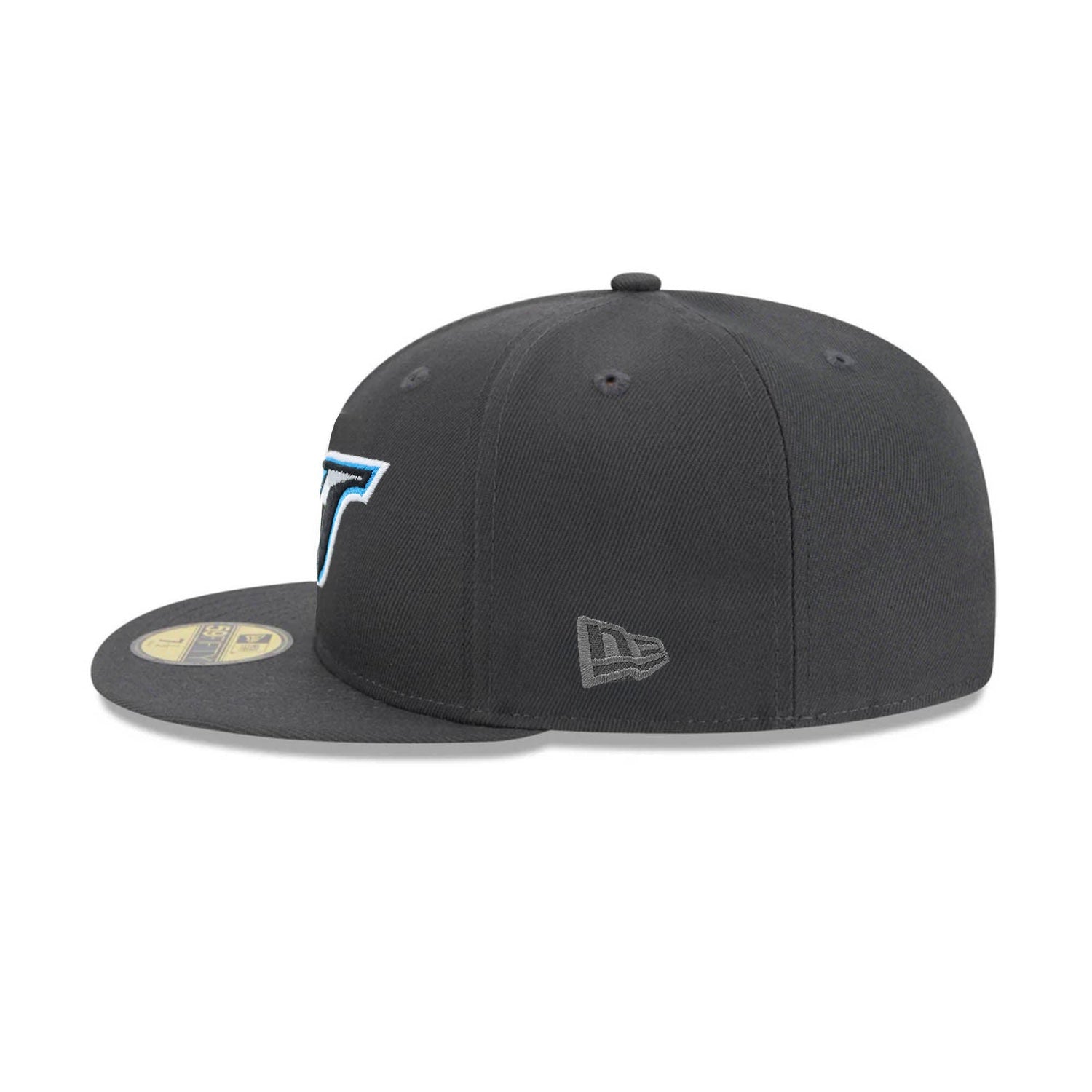 This Toronto Blue Jays 59FIFTY fitted cap features the striking “Game Bird” logo embroidered in icy blue and white on a deep charcoal crown and visor. Clean, minimal, and modern, this monochrome hat is a sharp departure from traditional Jays styles. Finished with a matching blue-and-white MLB Batterman logo on the back and a tonal New Era flag on the side for a sleek, understated look.